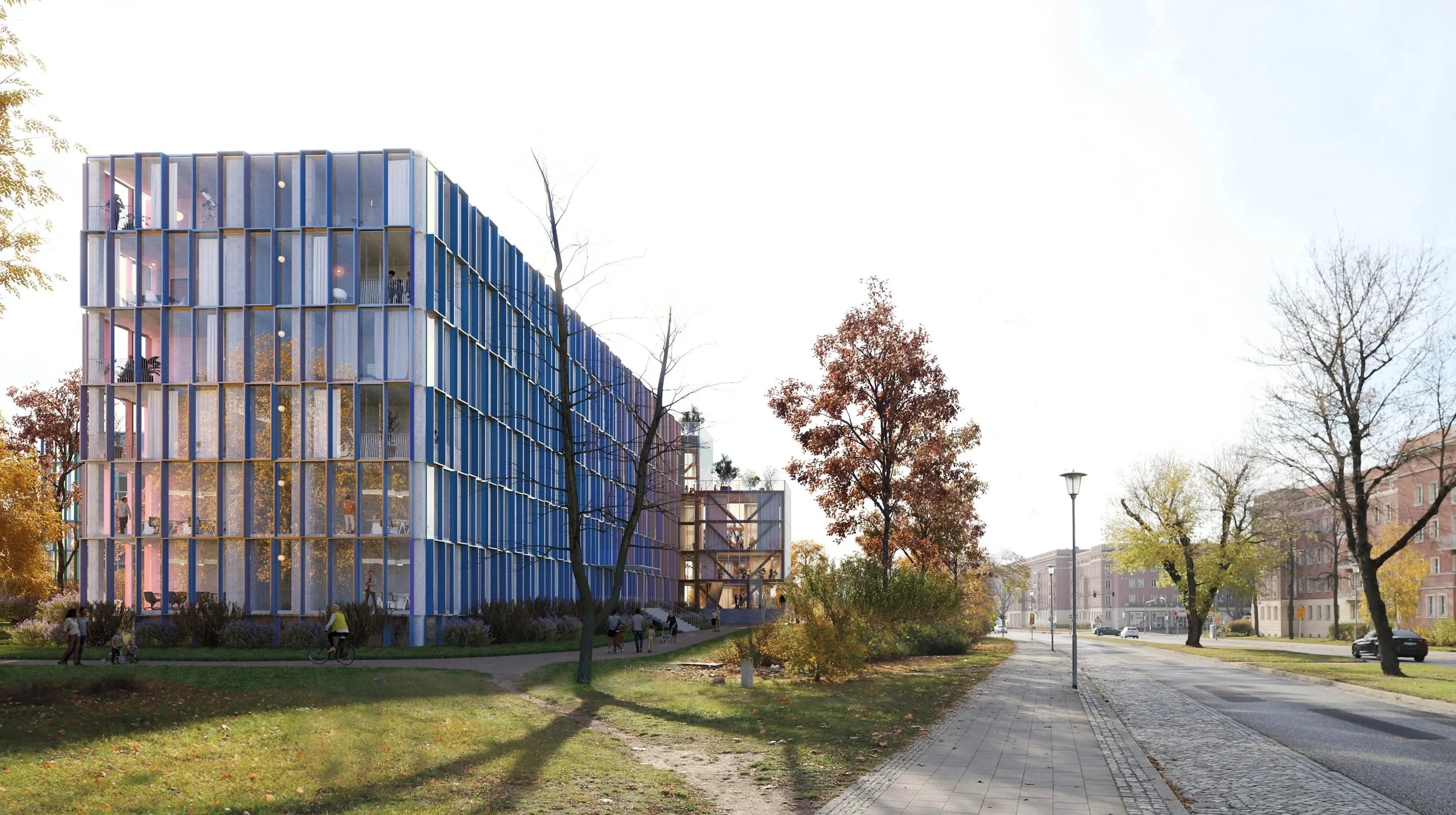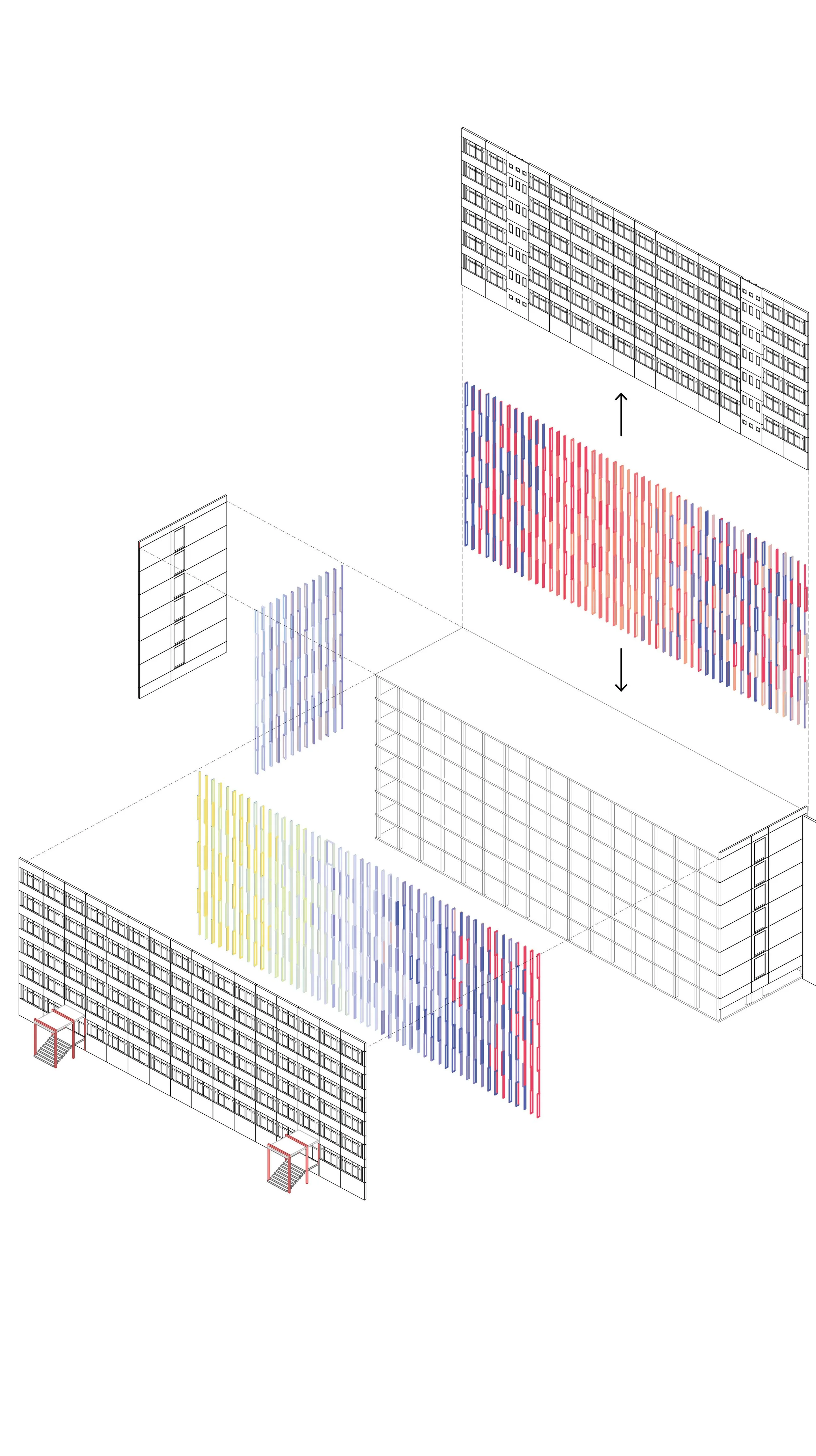 Eine neue Fassadenstruktur überführt die Strenge der bestehenden Baukörper in eine wandelbare, vielschichtige Erscheinung. Serielle Rahmenmodule – flexibel bestückbar – bilden ein dynamisches Raster, das unterschiedliche Nutzungen integriert und zugleich gestalterische Einheit wahrt. Die Idee des seriellen Bauens wird auf neuer Ebene weitergeführt.
