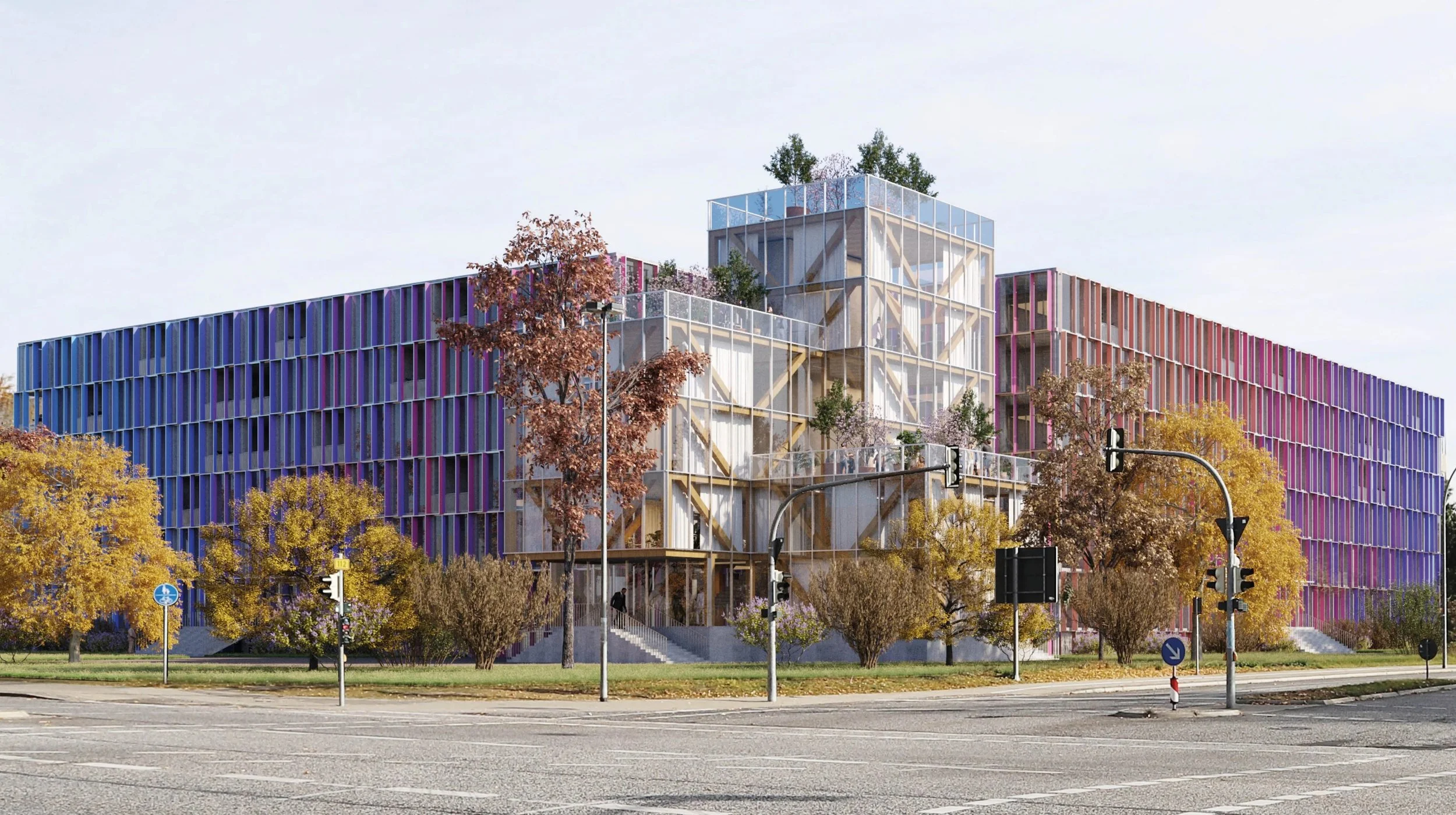 Ein skulpturaler Neubau setzt hier bewusst einen Kontrapunkt. Drei gestaffelte Volumen verschmelzen zu einer bewegten Figur, die durch ihre Plastizität neue Impulse in den Stadtraum trägt. Doppelt hohe Geschosse ermöglichen vielfältige Nutzungen, eine transparente Fassade schafft Offenheit, besonders bei Nacht. Die Holzhybridkonstruktion kontrastiert die schwere Struktur des Bestands, Dachterrassen erweitern den Raum nach außen und erschließen neue Perspektiven.