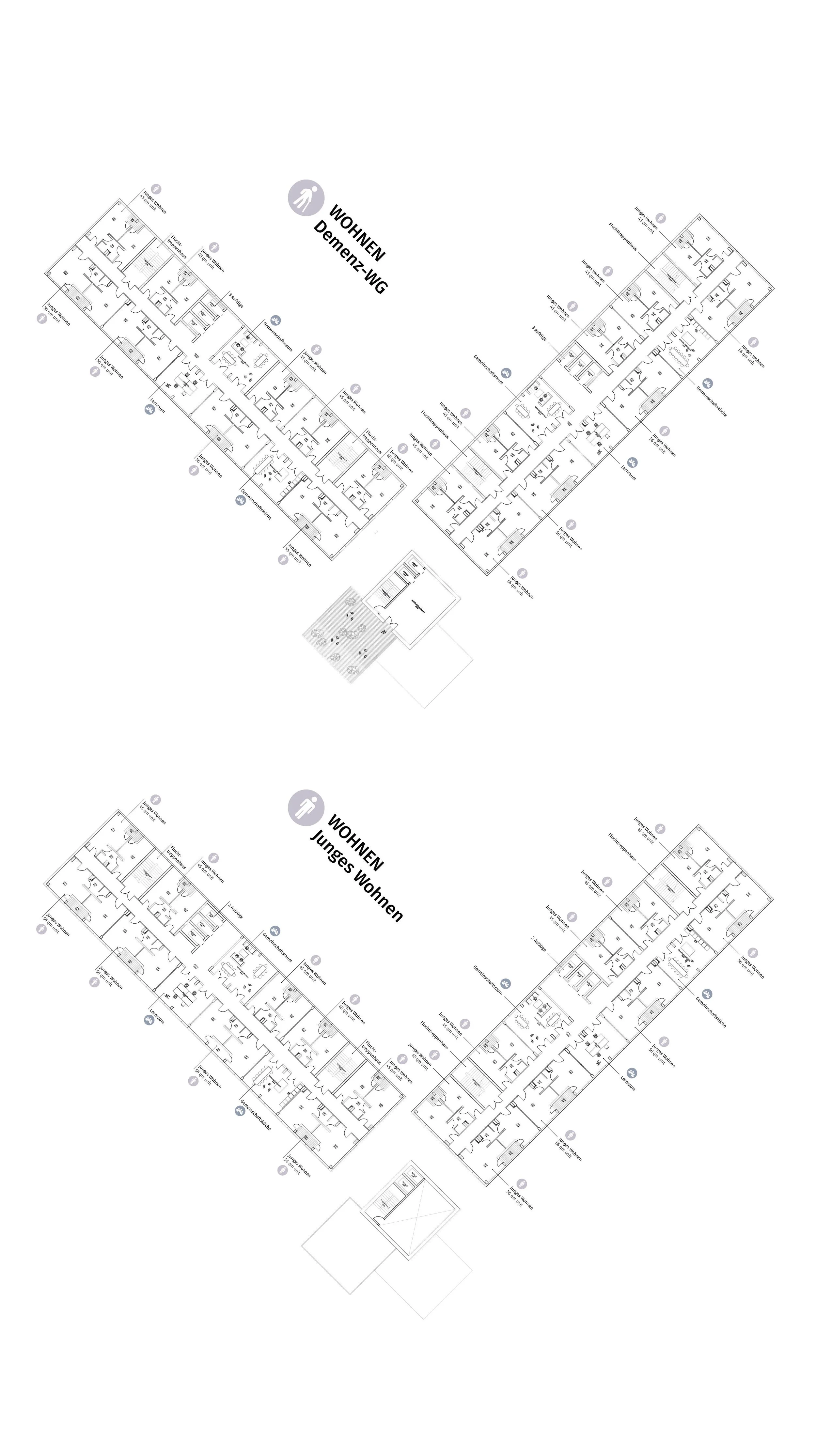 Im Inneren wird der Bestand geöffnet: nichttragende Wände weichen, die Stützenstruktur bleibt erhalten. Großzügige, innenliegende Loggien bringen Licht tief in die Erschließungszonen und schaffen vielseitige Übergangsräume. Ein modulares Grundrisssystem erlaubt unterschiedlichste Wohnformen – eine Architektur, die Wandelbarkeit als Prinzip versteht.